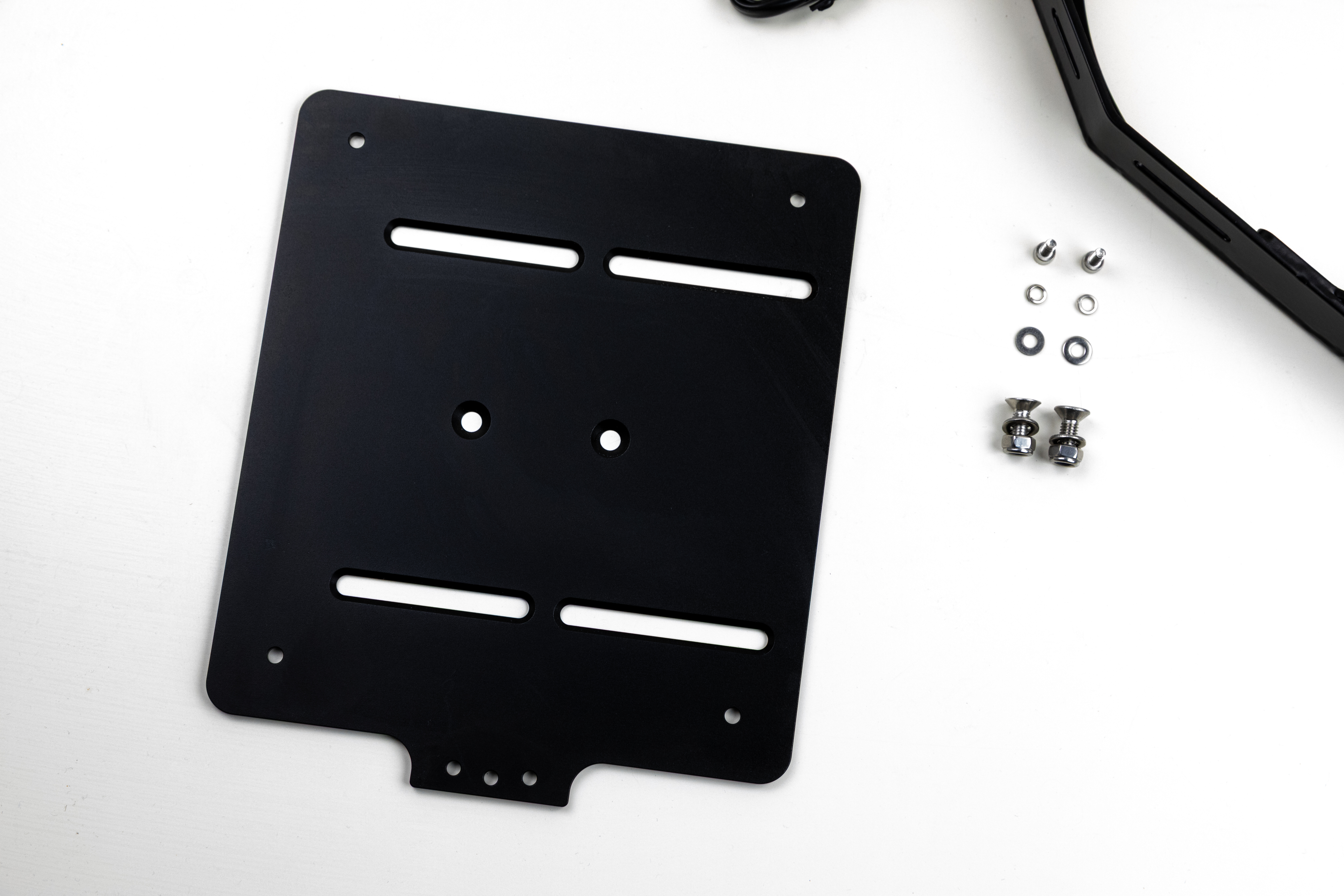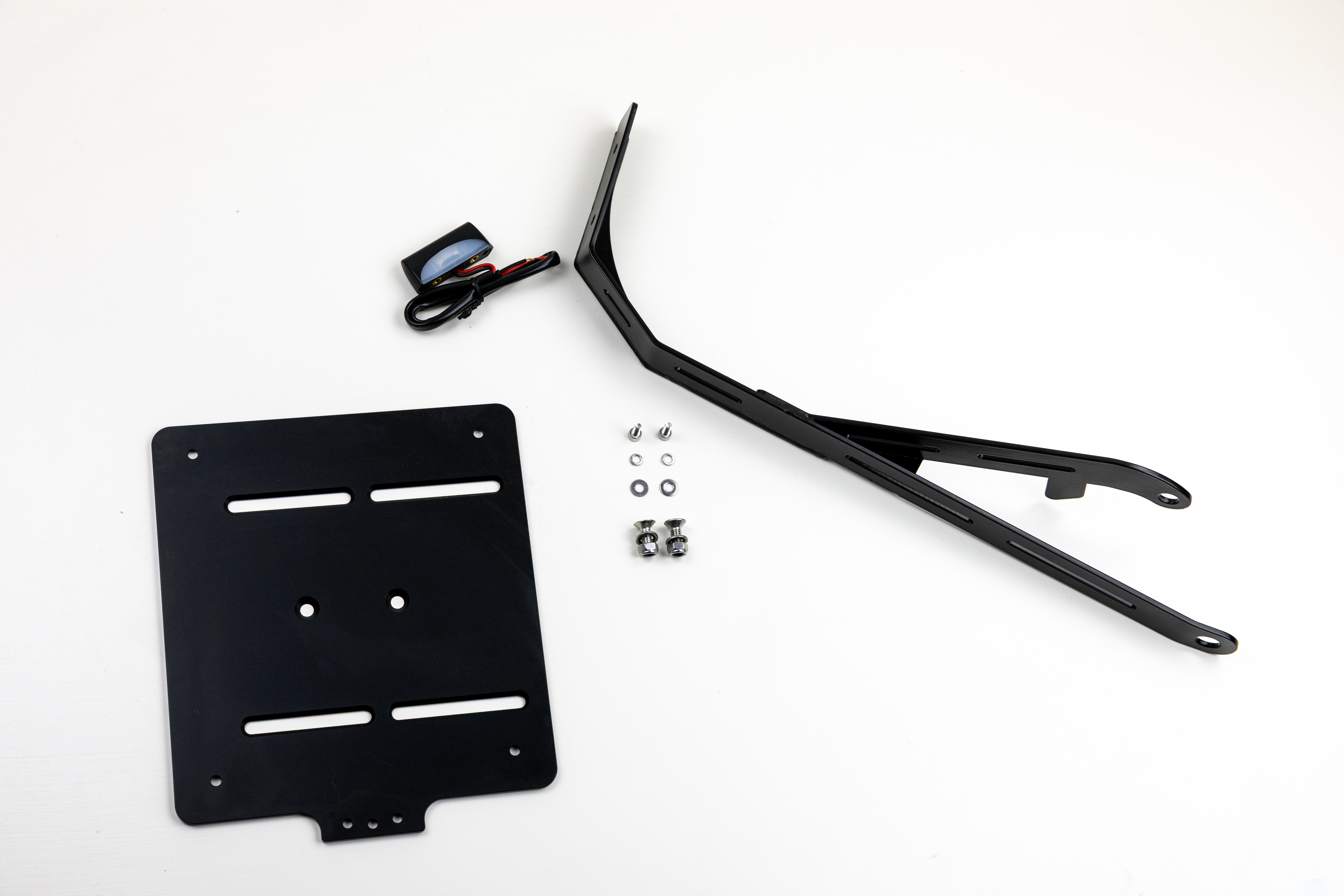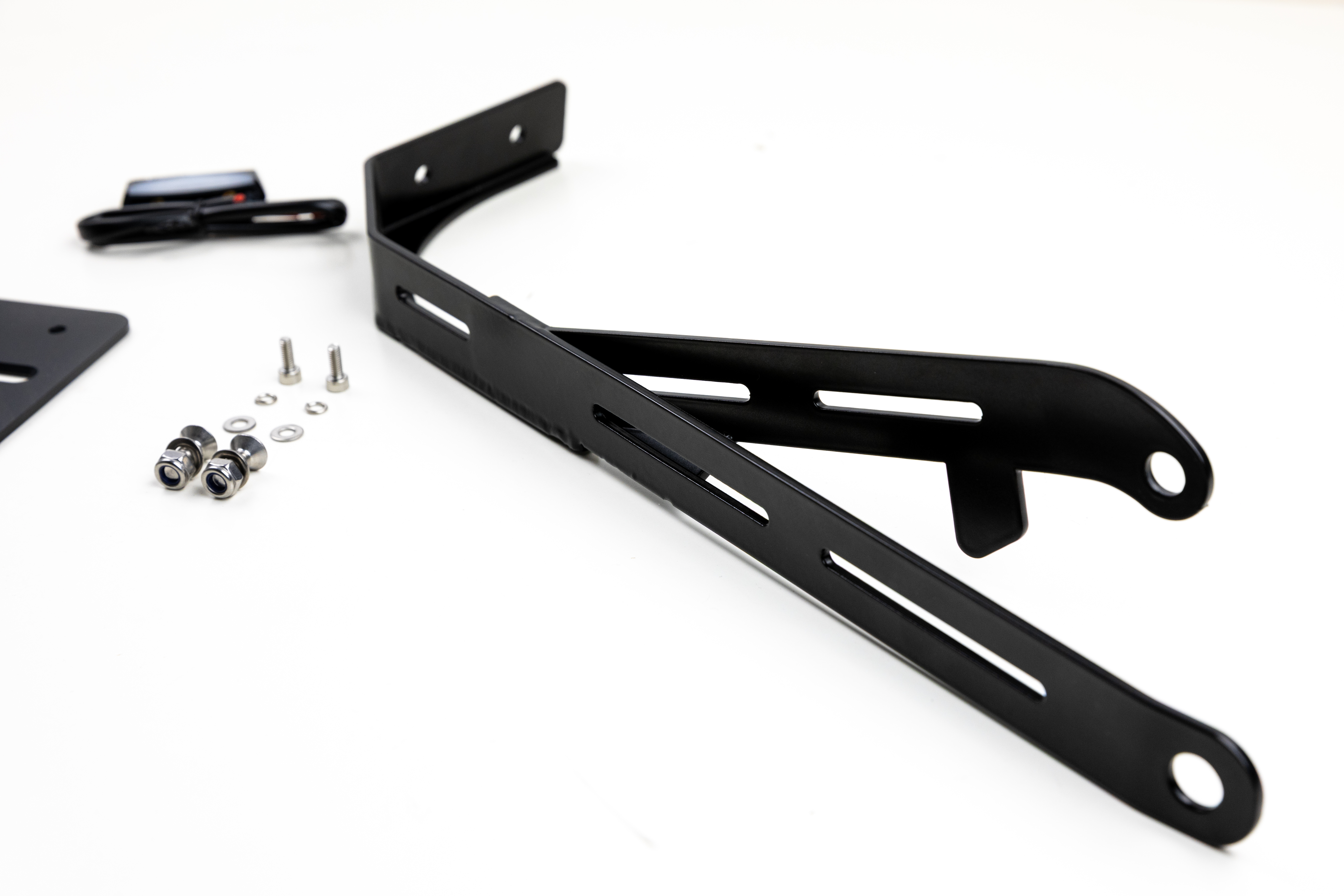 Hochwertiger, am Endantrieb befestigter, Kennzeichenträger aus Edelstahl, schwarz pulverbeschichtet. Der Winkel ist 100% TÜV konform und ein TÜV Teilegutachten nach Paragraf 19.3 liegt bei.