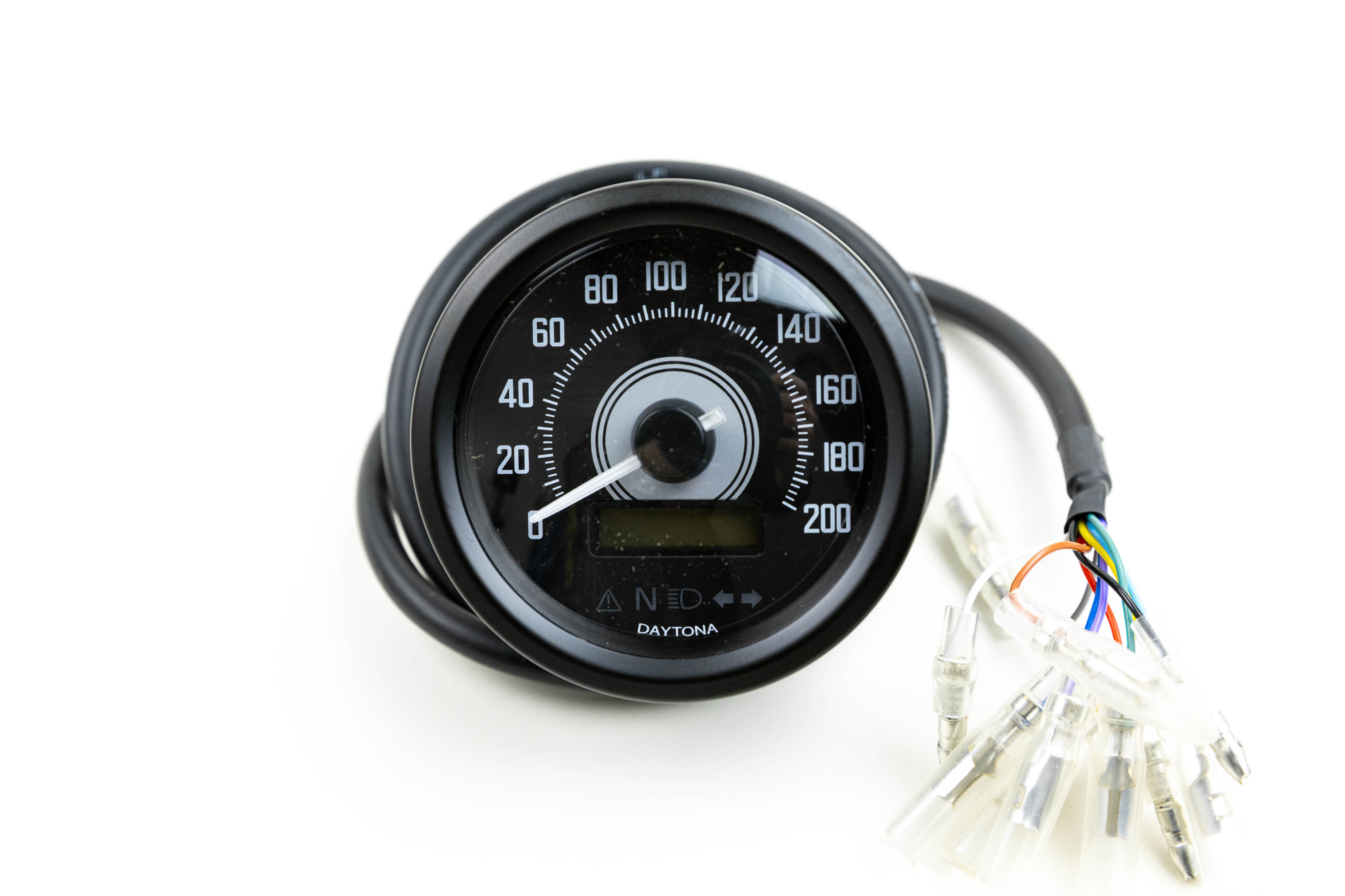 Kleines Rundinstrument mit 60mm Durchmesser und analoger Geschwindigkeitsanzeige bis 200km/h mit Kontrolleuchten und Display.