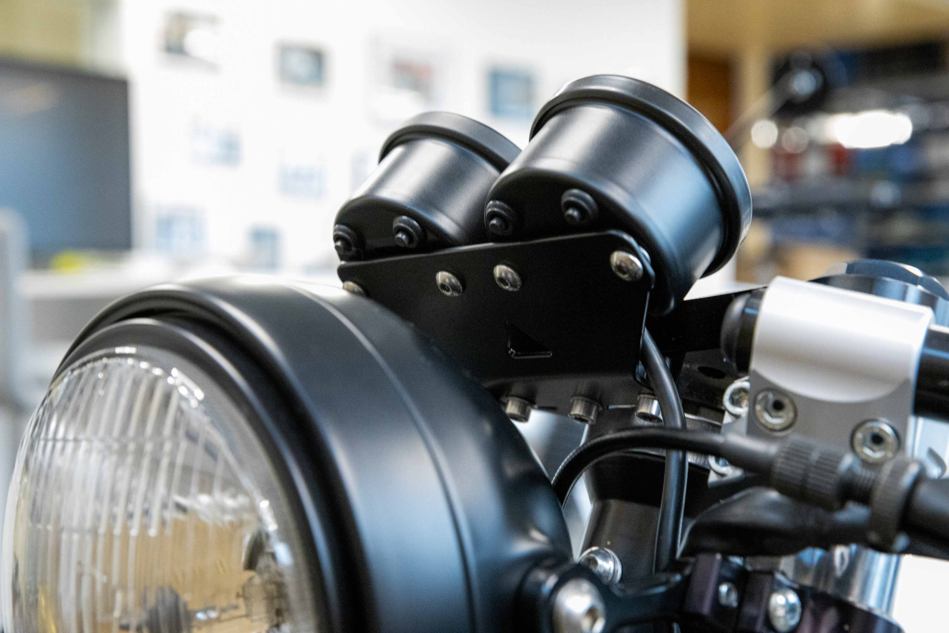 Aus rostfreiem VA Stahl gelaserter Tachohalter, passend für alle Sport-Evolution Gabelbrücken. Wird einfach von unten in den vorgesehenen Gewinden verschraubt. Passend für die Aufnahme von 2 Daytona 60 Instrumenten um Drehzahl und Geschwindigkeit gleichzeitig im Auge zu haben