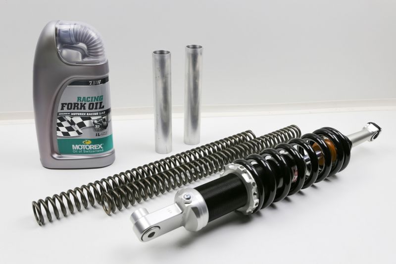 The Sport-Evolution fork spring kit, made from high quality stainless OTEVA 70 spring steel, offers higher reserves and reduces the strong springing tendency of the original fork. This leads to higher stability, better cornering behaviour and better response. The tendency to bob (rubber cow behaviour) is significantly reduced